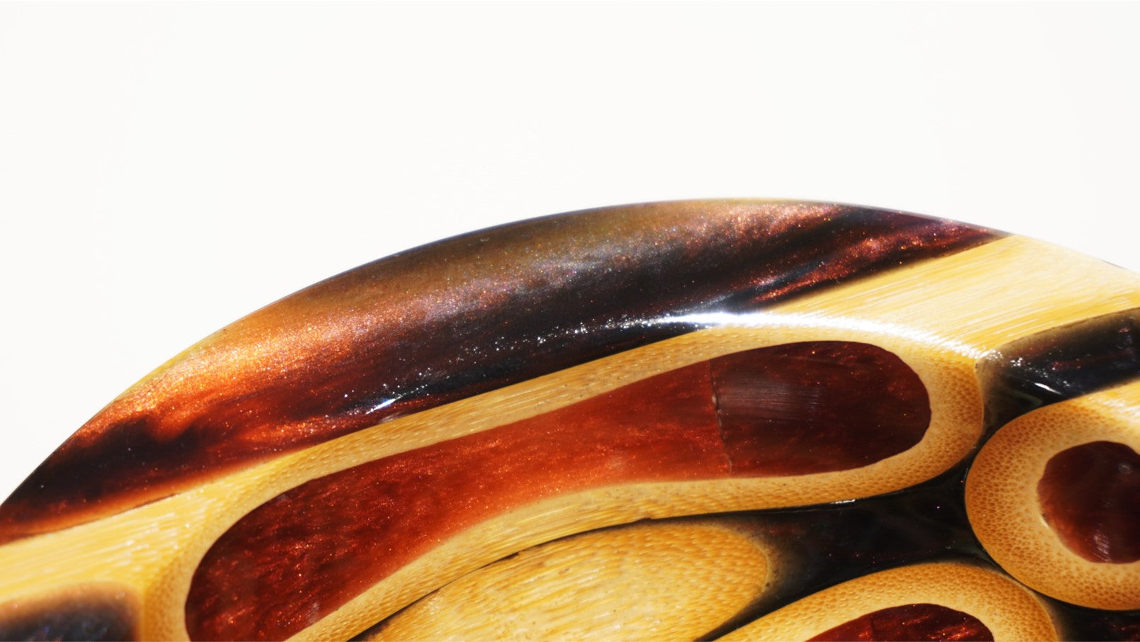 This bowl was made from lengths of 1" bamboo cast in epoxy resin, with wine red mica powder filling the insides of the bamboo and black mica powder filling the space outside of the bamboo. The bowl was finished with multiple coats of a hardening wipe-on varnish, making the final product durable and water resistant (but not waterproof).