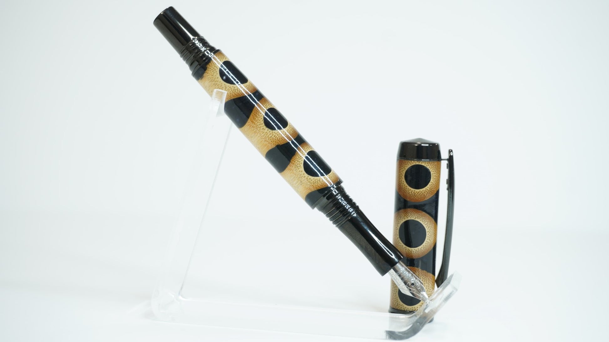 This fountain pen was made from pieces of 1" bamboo and epoxy resin with black mica pigment. The pen was finished with 12 coats of thin cyanoacrylate (thin super glue), making it highly durable, virtually waterproof, and stain resistant. The owner of this pen should be cautious about letting it fall on hard surfaces, though, such as concrete, tile, or stone, as the finish may scratch or even crack. This pen comes with a disposable ink cartridge (black ink) and a reusable ink pump that can be used with any ink colour preference you may have.