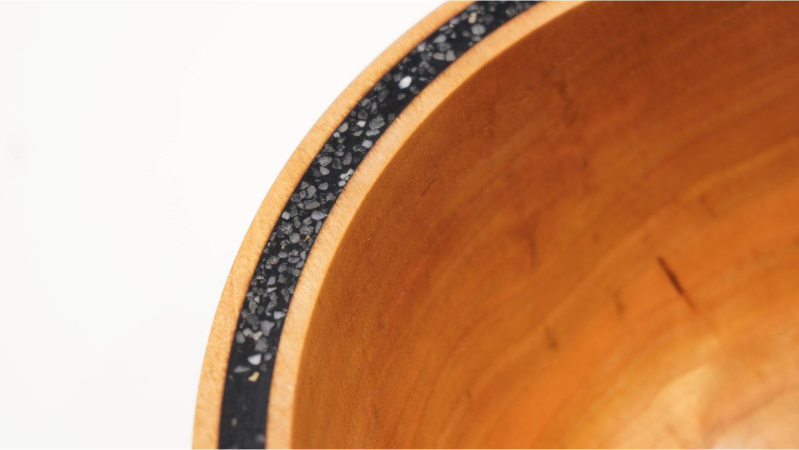 This bowl was made from a single piece of cherry. Once the bowl was mostly shaped, an inlay was turned into the rim, which was then filled with small black stones and cast in epoxy resin. The bowl was finished with a micro fine polishing paste and carnuba wax that was burnished into the bowl, making the final product durable and water resistant (but not waterproof).