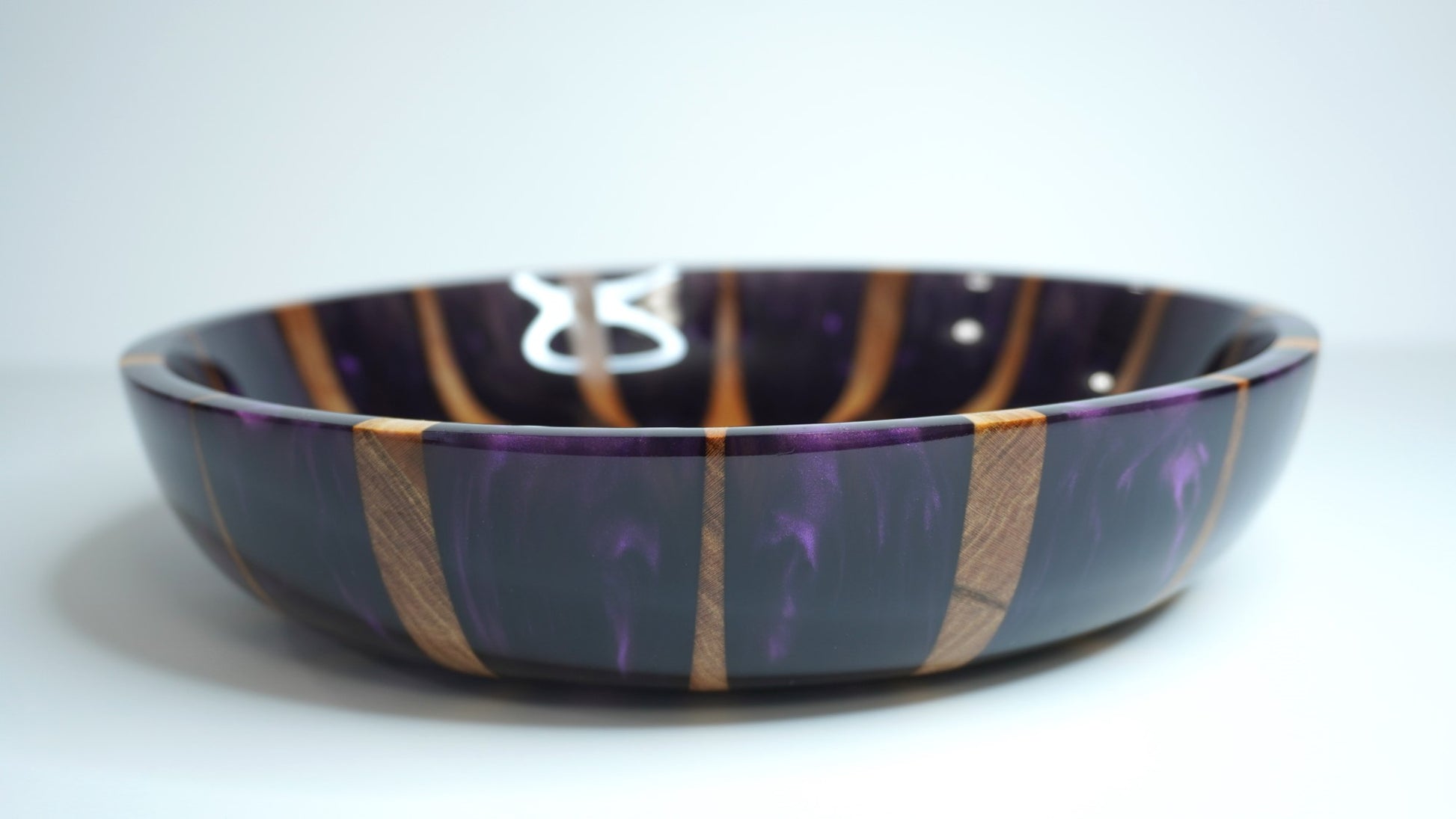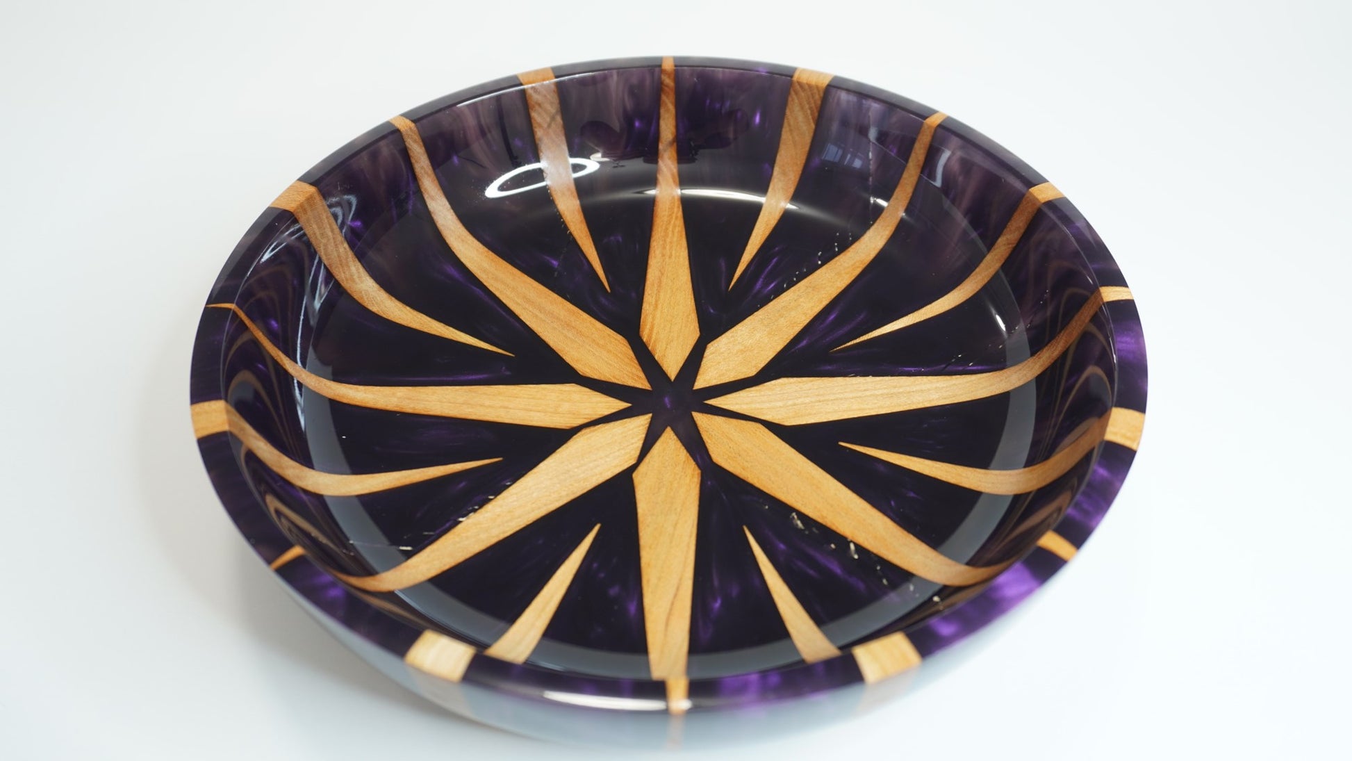 This bowl was made from pieces of cherry cut into "sunbeams" and cast in epoxy resin dyed with a dark purple mica pigment. The bowl was finished with multiple coats of a hardening wipe-on varnish, making the final product durable and water resistant (but not waterproof).