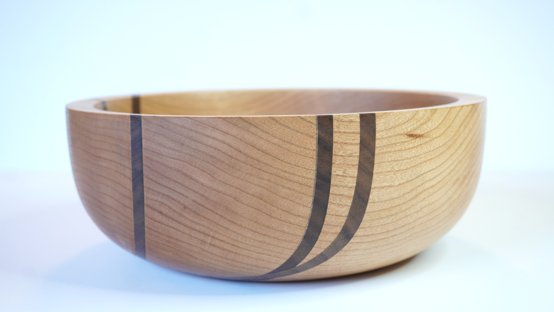 This bowl was made from a single piece of cherry with 3 separate walnut inlays glued together. Once turned, the bowl was sanded up to 400 grit and finished with a single coat of tung oil and carnuba wax.