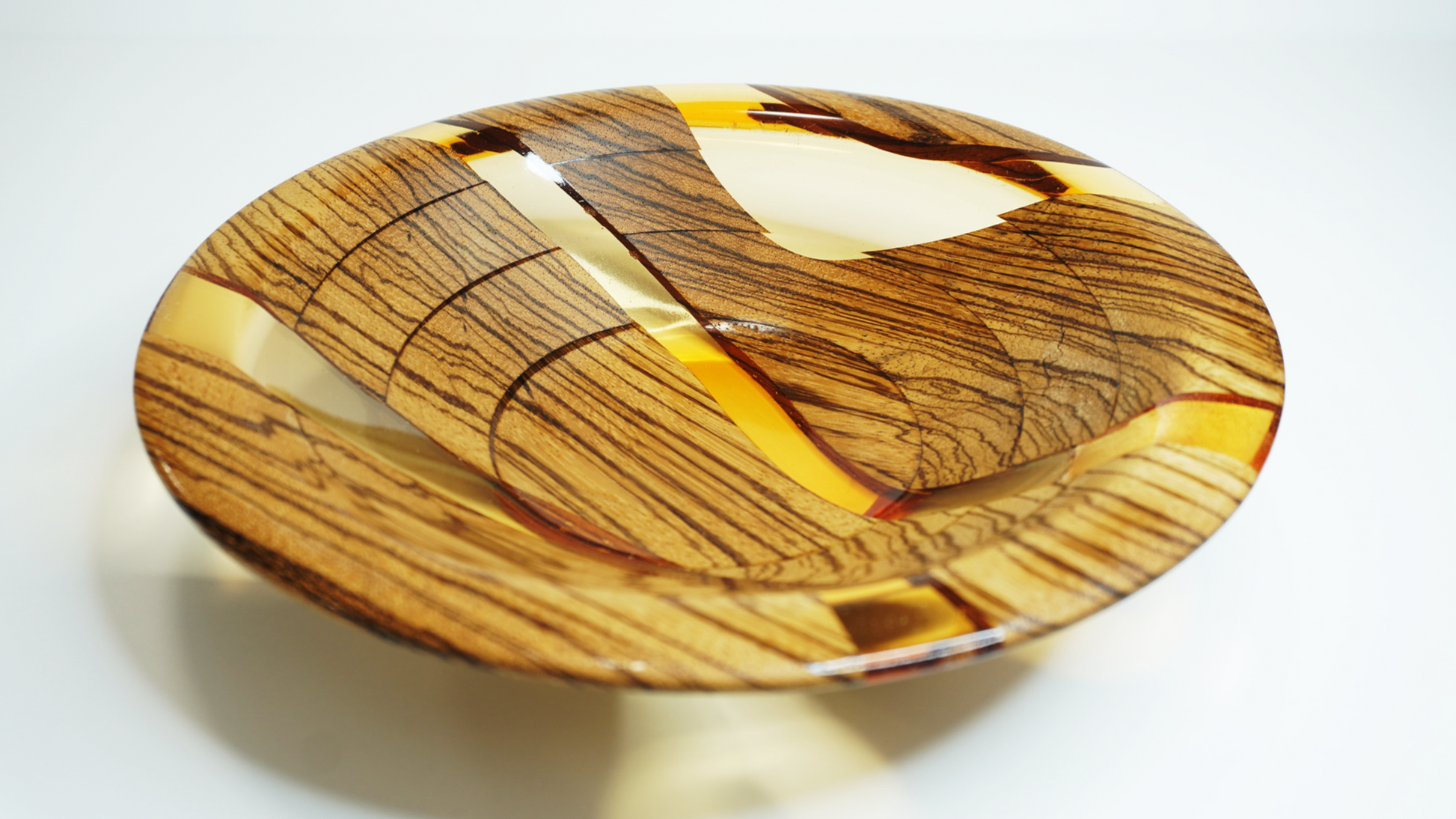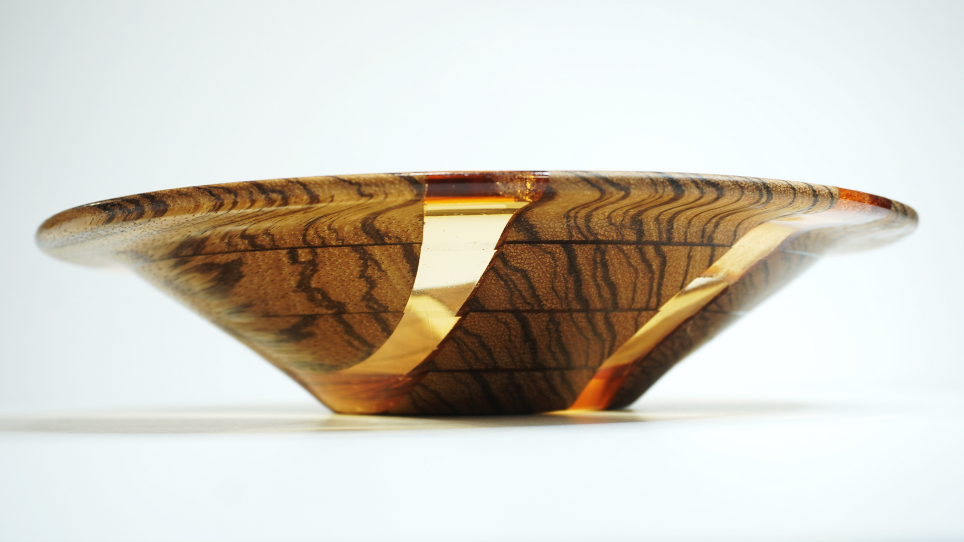 This bowl was made from a board crafted from strips of wavy zebra wood and cast in a transparent epoxy resin dyed a tangerine orange. From this board, multiple rings were turned off on a lathe and stacked atop one another to make a final bowl. The bowl was finished with multiple coats of a hardening wipe-on varnish, making the final product durable and water resistant (but not waterproof).