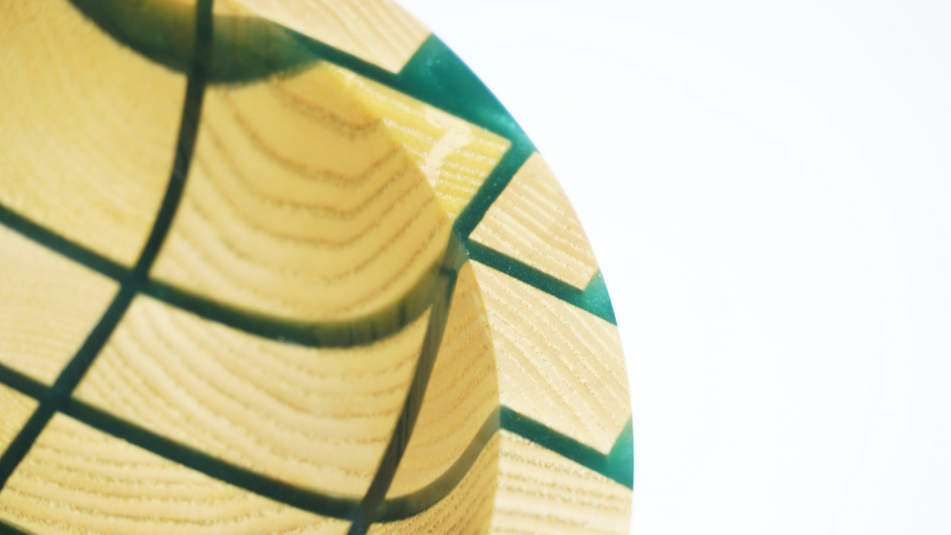 This bowl was made from multiple cut-offs of ash arranged in a circle, spaced apart with thin wood skewers, and cast in epoxy resin dyed with a turquoise mica pigment. The bowl was finished with multiple coats of a hardening wipe-on varnish, making the final product durable and water resistant (but not waterproof).