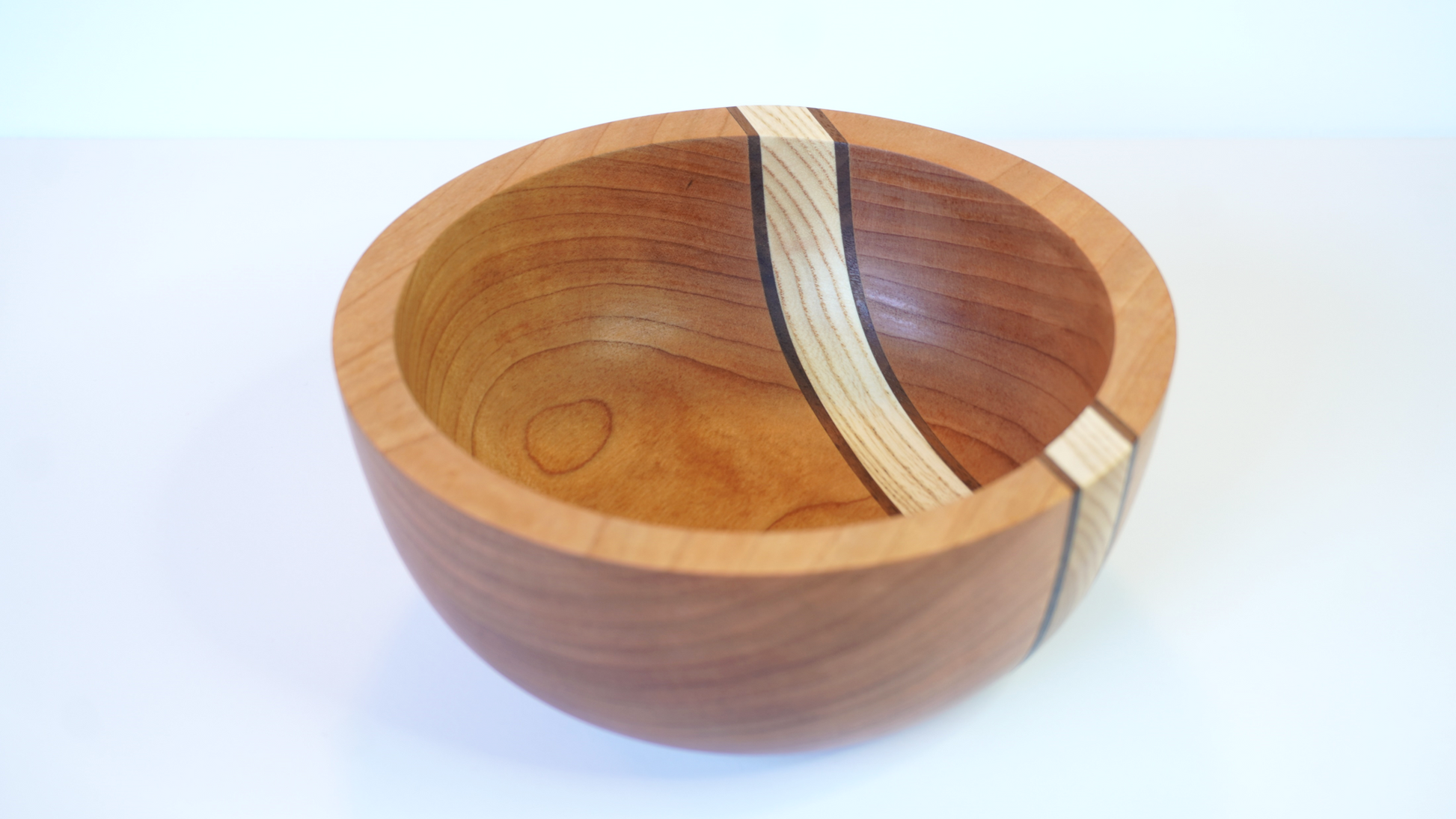 This bowl was made from a single piece of cherry with an inlay composed of a thicker piece of ash and two thin strips of black walnut glued together. Once turned, the bowl was sanded up to 400 grit and finished with a single coat of tung oil and carnuba wax.